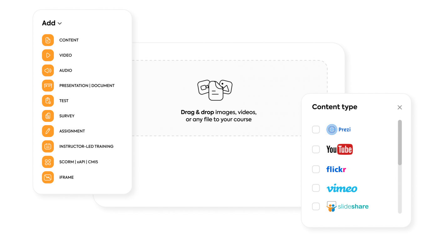 Easily drag and drop various media types into your course—videos, presentations, and documents. Create courses from scratch or repurpose existing content. Enhance interactivity by uploading SCORM, xAPI, or cmi5 files.